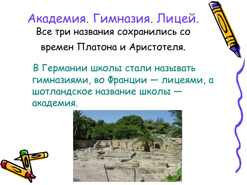 Таким образом, уже в античности можно наблюдать постепенный сдвиг значения: от конкретного «места для обнажённых упражнений» к более широкому понятию образовательного и воспитательного пространства. Это был важный этап семантической эволюции слова.