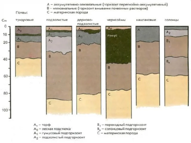 Почва имеет слоистое строение, которое называют почвенным профилем. Горизонты почвы различаются по цвету, составу, содержанию органических веществ и степени выветривания. В классическом почвенном профиле выделяют следующие горизонты: