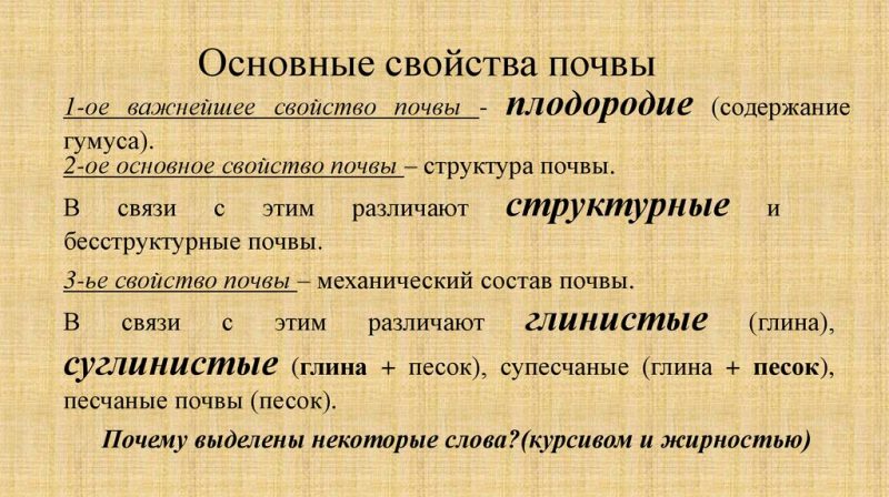 Кислотность (pH) — определяет доступность питательных веществ. Почвы могут быть кислые, нейтральные или щелочные.